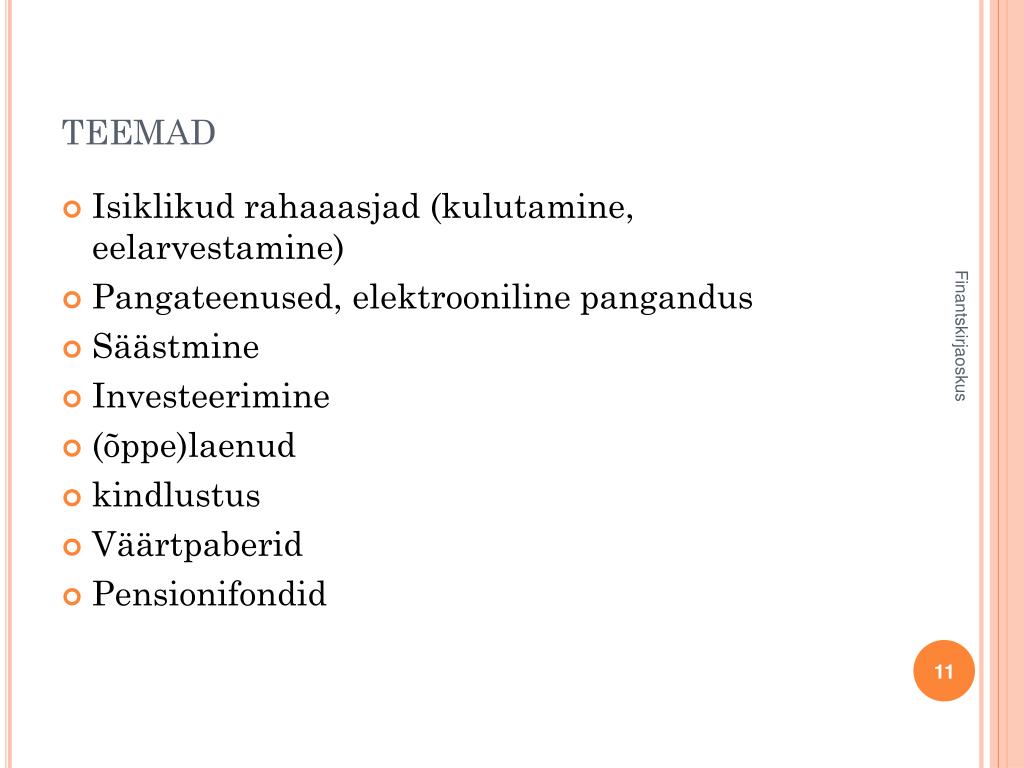 teemad • Isiklikud rahaaasjad (kulutamine, eelarvestamine) • Pangateenused, elektrooniline pangandus • Säästmine • Investeerimine • (õppe)laenud • kindlustus • Väärtpaberid • Pensionifondid Finantskirjaoskus