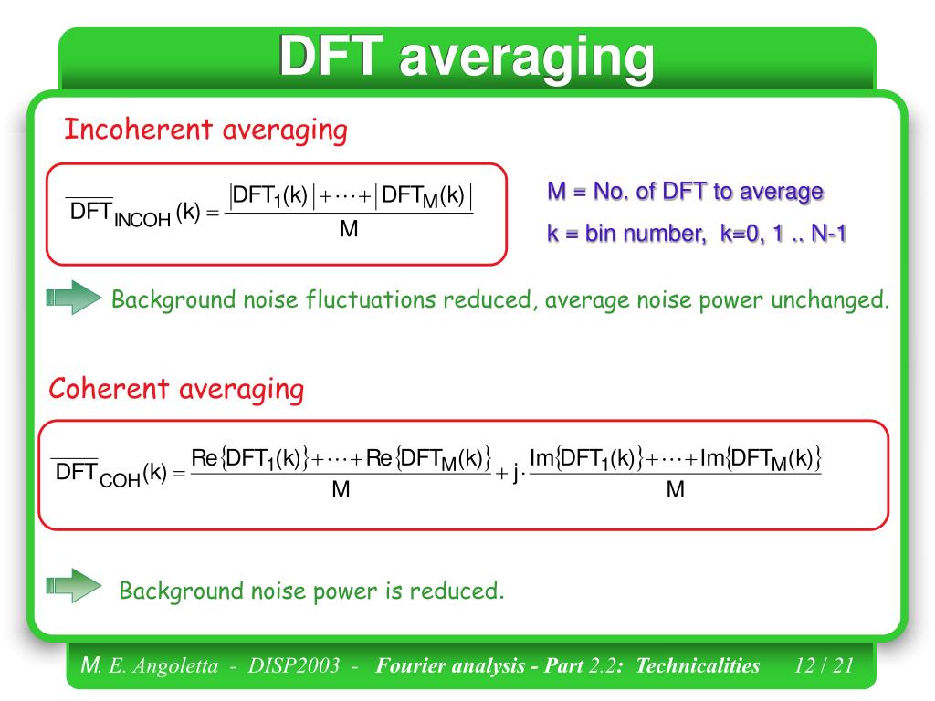 Incoherent averaging M = No. of DFT to average k = bin number, k=0, 1 .. N-1 Background noise fluctuations reduced, average noise power unchanged. Coherent averaging Background noise power is reduced. DFT averaging M. E. Angoletta - DISP2003 - Fourier analysis - Part 2.2: Technicalities 12 / 21