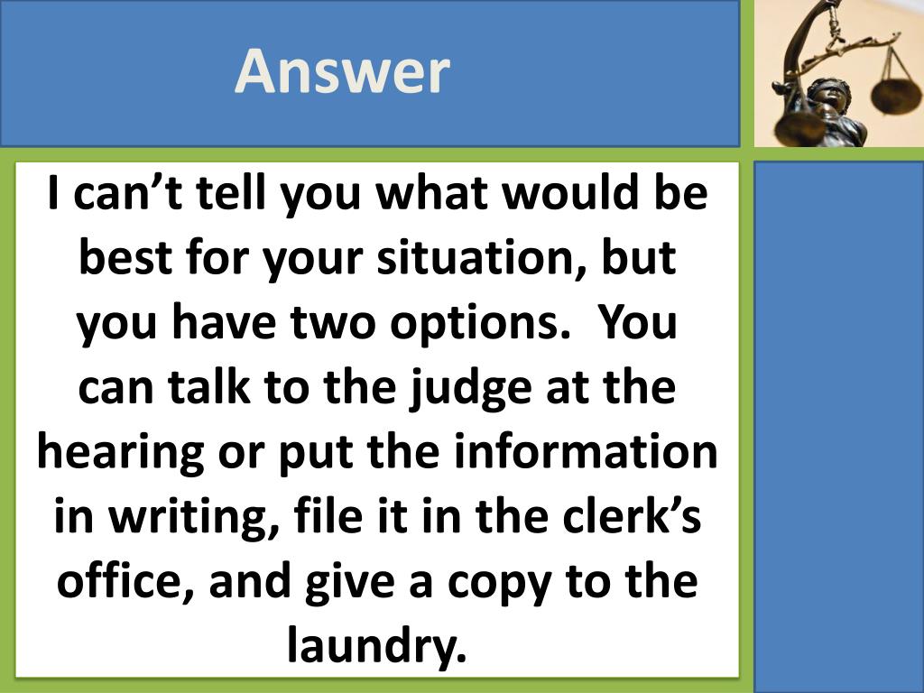 Answer I can’t tell you what would be best for your situation, but you have two options. You can talk to the judge at the hearing or put the information in writing, file it in the clerk’s office, and give a copy to the laundry.