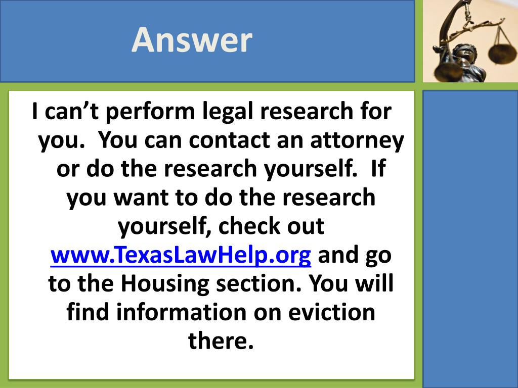 Answer I can’t perform legal research for you. You can contact an attorney or do the research yourself. If you want to do the research yourself, check out www.TexasLawHelp.org and go to the Housing section. You will find information on eviction there.