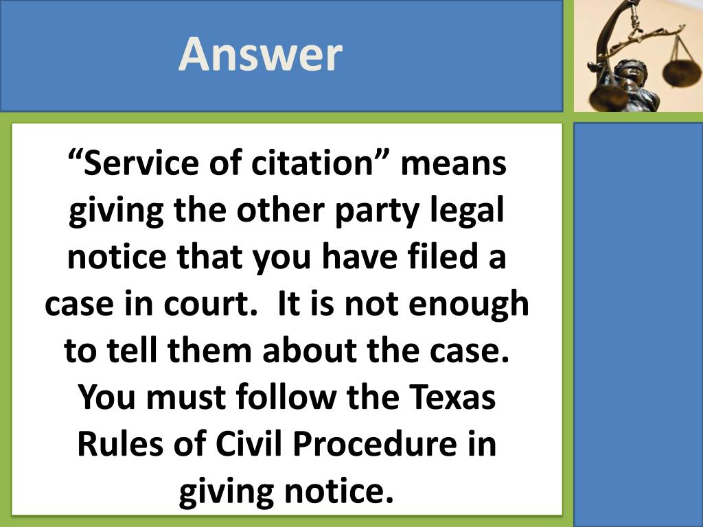 Answer “Service of citation” means giving the other party legal notice that you have filed a case in court. It is not enough to tell them about the case. You must follow the Texas Rules of Civil Procedure in giving notice.