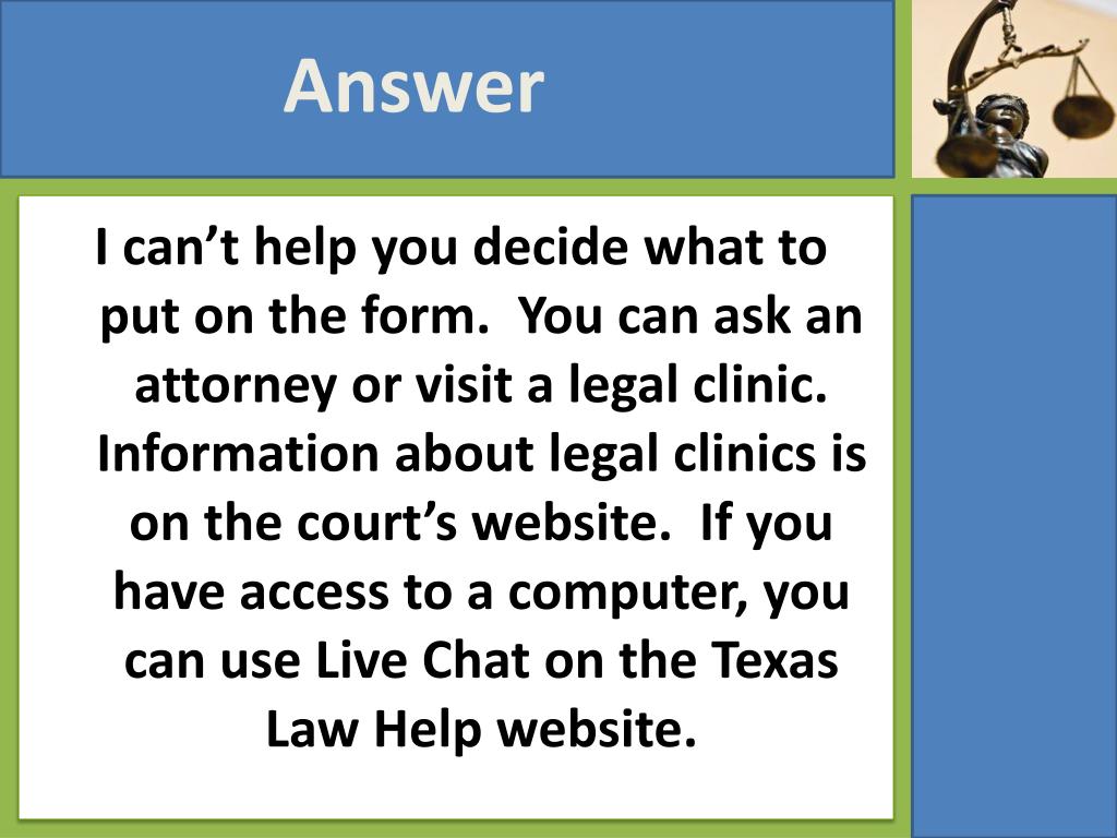 Answer I can’t help you decide what to put on the form. You can ask an attorney or visit a legal clinic. Information about legal clinics is on the court’s website. If you have access to a computer, you can use Live Chat on the Texas Law Help website.