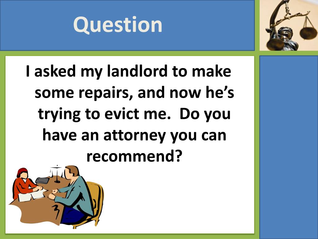 Question I asked my landlord to make some repairs, and now he’s trying to evict me. Do you have an attorney you can recommend?