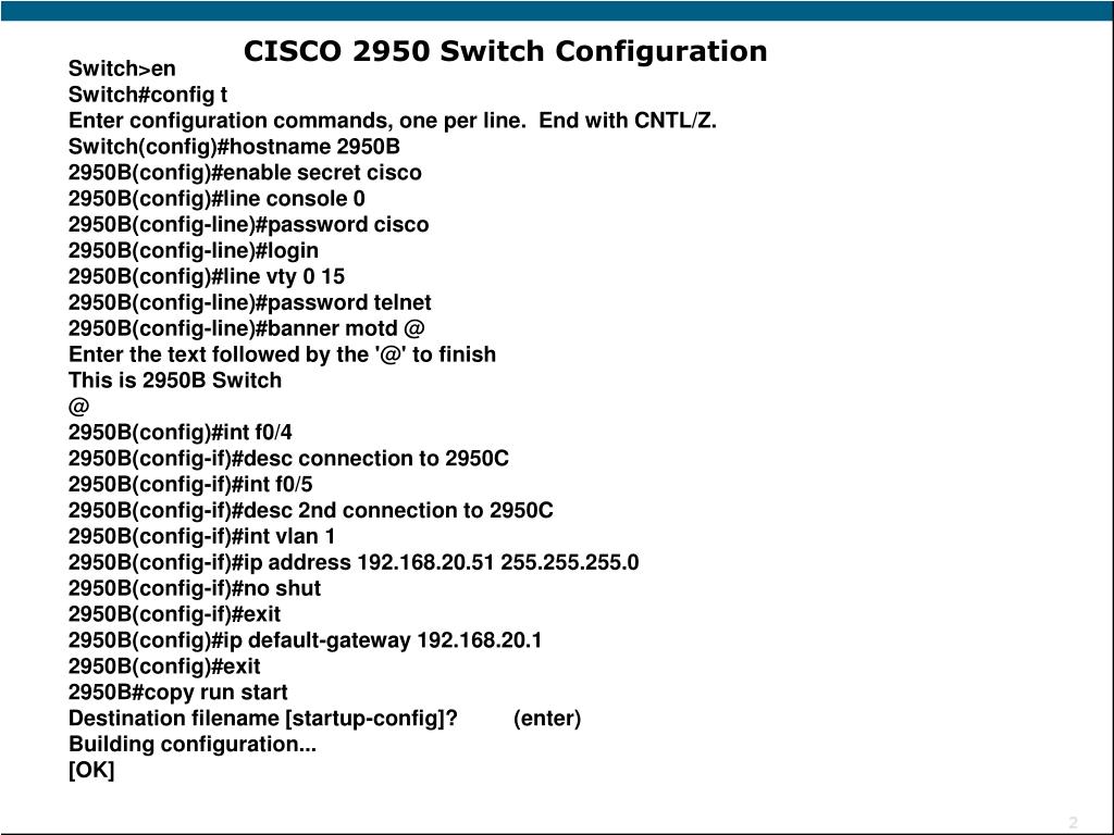CISCO 2950 Switch Configuration Switch>en Switch#config t Enter configuration commands, one per line. End with CNTL/Z. Switch(config)#hostname 2950B 2950B(config)#enable secret cisco 2950B(config)#line console 0 2950B(config-line)#password cisco 2950B(config-line)#login 2950B(config)#line vty 0 15 2950B(config-line)#password telnet 2950B(config-line)#banner motd @ Enter the text followed by the '@' to finish This is 2950B Switch @ 2950B(config)#int f0/4 2950B(config-if)#desc connection to 2950C 2950B(config-if)#int f0/5 2950B(config-if)#desc 2nd connection to 2950C 2950B(config-if)#int vlan 1 2950B(config-if)#ip address 192.168.20.51 255.255.255.0 2950B(config-if)#no shut 2950B(config-if)#exit 2950B(config)#ip default-gateway 192.168.20.1 2950B(config)#exit 2950B#copy run start Destination filename [startup-config]? (enter) Building configuration... [OK]
