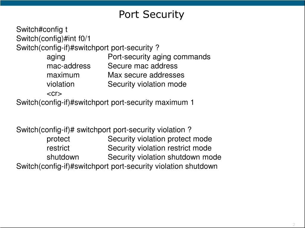 Port Security Switch(config-if)#switchport port-security mac-address sticky Switch(config-if)#switchport port-security maximum 2 Switch(config-if)#switchport port-security violation shutdown