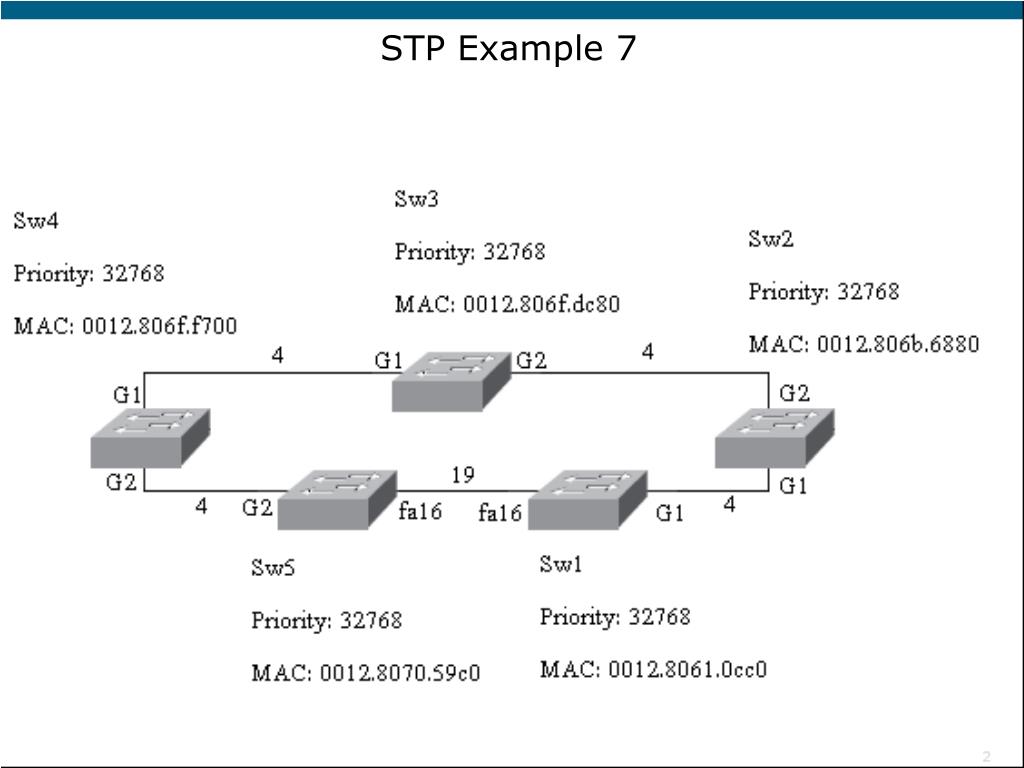 Switch#sh spanning-tree VLAN0001 Spanning tree enabled protocol ieee Root ID Priority 32769 Address 0012.8061.0cc0 Cost 8 Port 25 (GigabitEthernet0/1) Hello Time 2 sec Max Age 20 sec Forward Delay 15 sec Bridge ID Priority 32769 (priority 32768 sys-id-ext 1) Address 0012.806b.6880 Hello Time 2 sec Max Age 20 sec Forward Delay 15 sec Aging Time 300 Interface Role Sts Cost Prio.Nbr Type ---------------- ---- --- --------- -------- -------------------------------- Fa0/16 Altn BLK 19 128.16 P2p Gi0/1 Root FWD 4 128.25 P2p Switch#show spanning-tree vlan 2