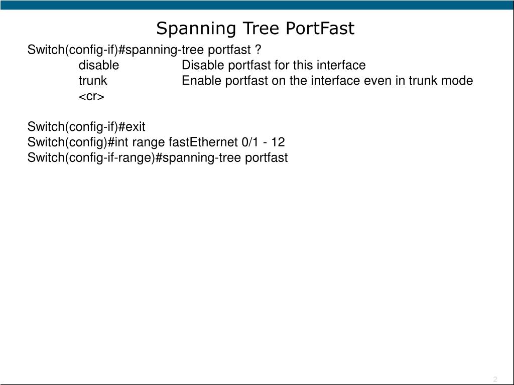 Spanning Tree PortFast Switch(config-if)#spanning-tree portfast ? disable Disable portfast for this interface trunk Enable portfast on the interface even in trunk mode <cr> Switch(config-if)#exit Switch(config)#int range fastEthernet 0/1 - 12 Switch(config-if-range)#spanning-tree portfast
