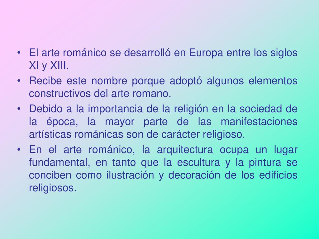 El arte románico se desarrolló en Europa entre los siglos XI y XIII. • Recibe este nombre porque adoptó algunos elementos constructivos del arte romano. • Debido a la importancia de la religión en la sociedad de la época, la mayor parte de las manifestaciones artísticas románicas son de carácter religioso. • En el arte románico, la arquitectura ocupa un lugar fundamental, en tanto que la escultura y la pintura se conciben como ilustración y decoración de los edificios religiosos.