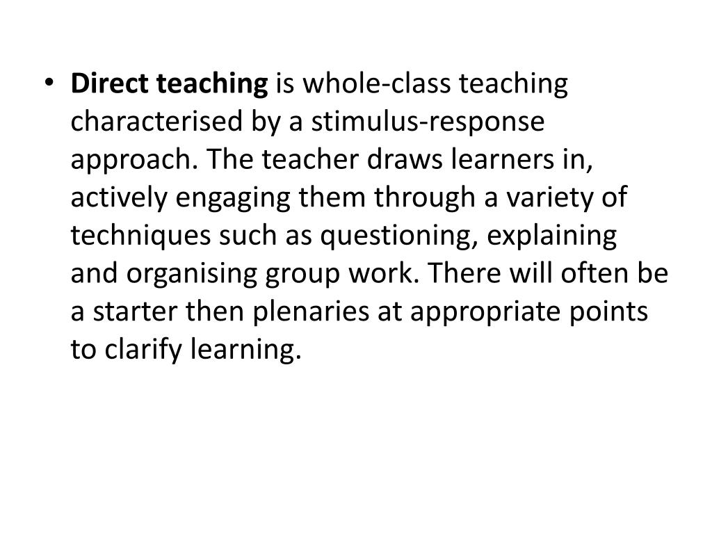 Direct teachingis whole-classteachingcharacterisedby a stimulus-responseapproach. Theteacherdrawslearners in, activelyengagingthemthrougha varietyof techniquessuch as questioning, explainingandorganisinggroupwork. Therewilloften be a starterthenplenaries at appropriatepointstoclarifylearning.