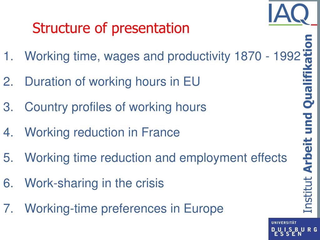 Structure of presentation Working time, wages and productivity 1870 - 1992 Duration of working hours in EU Country profiles of working hours Working reduction in France Working time reduction and employment effects Work-sharing in the crisis Working-time preferences in Europe