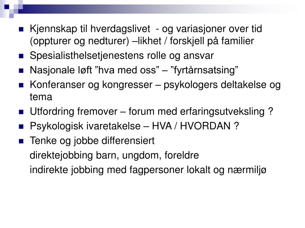 Kjennskap til hverdagslivet - og variasjoner over tid (oppturer og nedturer) –likhet / forskjell på familier • Spesialisthelsetjenestens rolle og ansvar • Nasjonale løft ”hva med oss” – ”fyrtårnsatsing” • Konferanser og kongresser – psykologers deltakelse og tema • Utfordring fremover – forum med erfaringsutveksling ? • Psykologisk ivaretakelse – HVA / HVORDAN ? • Tenke og jobbe differensiert direktejobbing barn, ungdom, foreldre indirekte jobbing med fagpersoner lokalt og nærmiljø