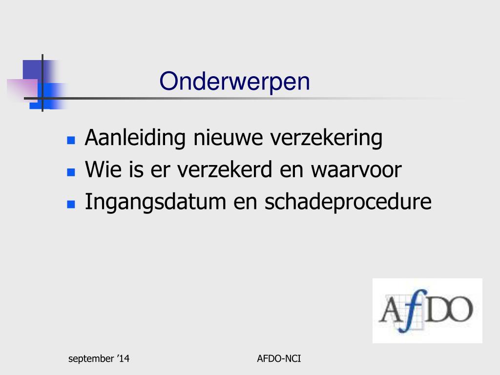 Onderwerpen • Aanleiding nieuwe verzekering • Wie is er verzekerd en waarvoor • Ingangsdatum en schadeprocedure AFDO-NCI