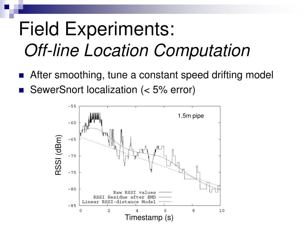 1.5m pipe RSSI (dBm) Timestamp (s) Field Experiments: Off-line Location Computation • After smoothing, tune a constant speed drifting model • SewerSnort localization (< 5% error)