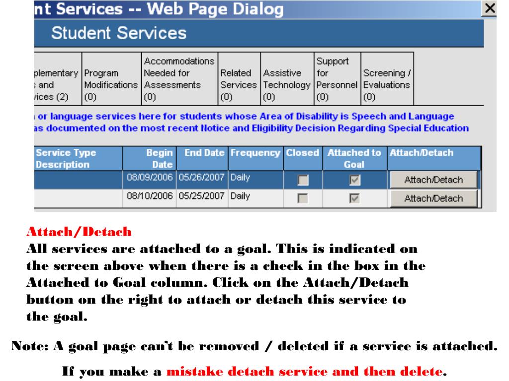 Attach/Detach All services are attached to a goal. This is indicated on the screen above when there is a check in the box in the Attached to Goal column. Click on the Attach/Detach button on the right to attach or detach this service to the goal. Note: A goal page can’t be removed / deleted if a service is attached. If you make a mistake detach service and then delete.