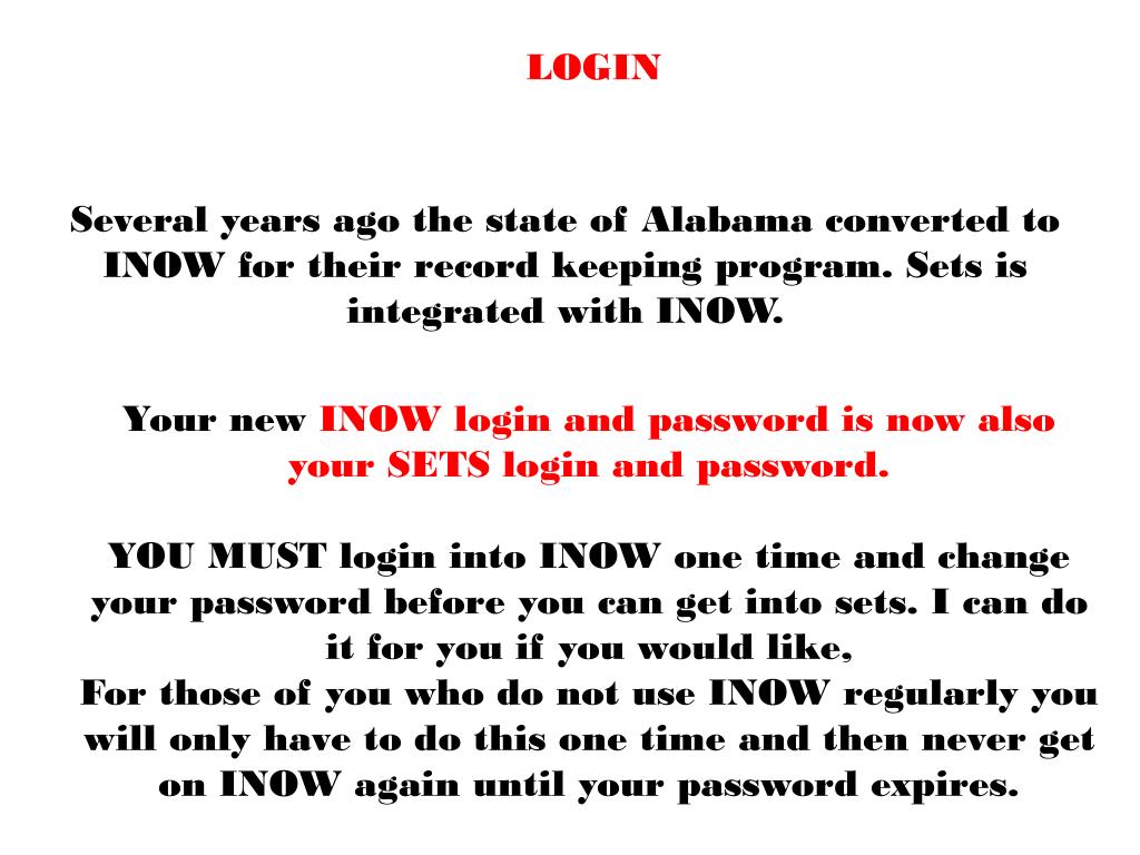 LOGIN Several years ago the state of Alabama converted to INOW for their record keeping program. Sets is integrated with INOW. Your new INOW login and password is now also your SETS login and password. YOU MUST login into INOW one time and change your password before you can get into sets. I can do it for you if you would like,For those of you who do not use INOW regularly you will only have to do this one time and then never get on INOW again until your password expires.