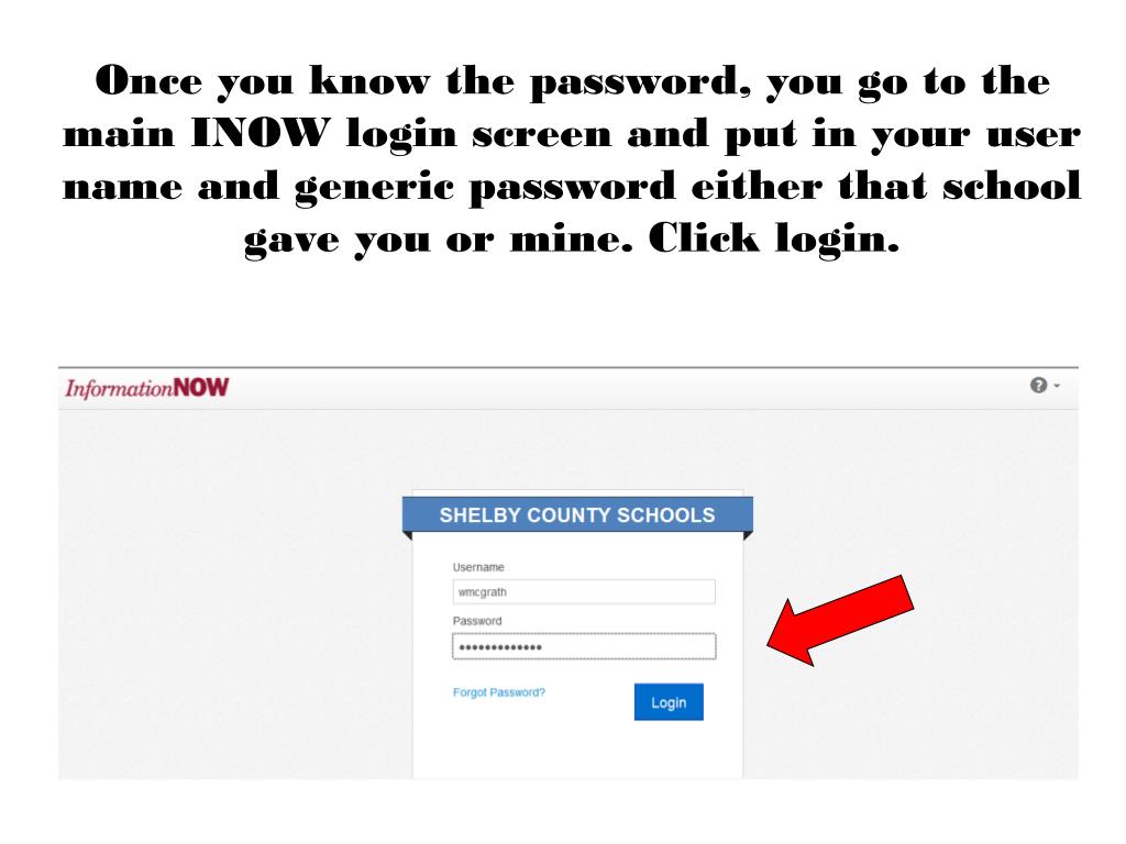 Here is how you find INOW: On your computer go to Shelby County Webpage. Select Teacher and Staff. Go to Logins. INOWPortal. When the INOW screen opens you will se this Your user name login will be the same as what you use to sign onto your home directory / email. e.g. wmcgrath
