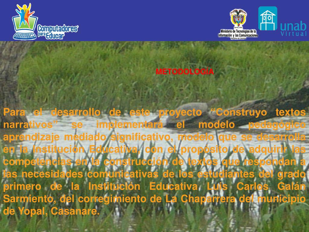 METODOLOGÍA Para el desarrollo de este proyecto “Construyo textos narrativos” se implementará el modelo pedagógico aprendizaje mediado significativo, modelo que se desarrolla en la Institución Educativa, con el propósito de adquirir las competencias en la construcción de textos que respondan a las necesidades comunicativas de los estudiantes del grado primero de la Institución Educativa Luis Carlos Galán Sarmiento, del corregimiento de La Chaparrera del municipio de Yopal, Casanare.