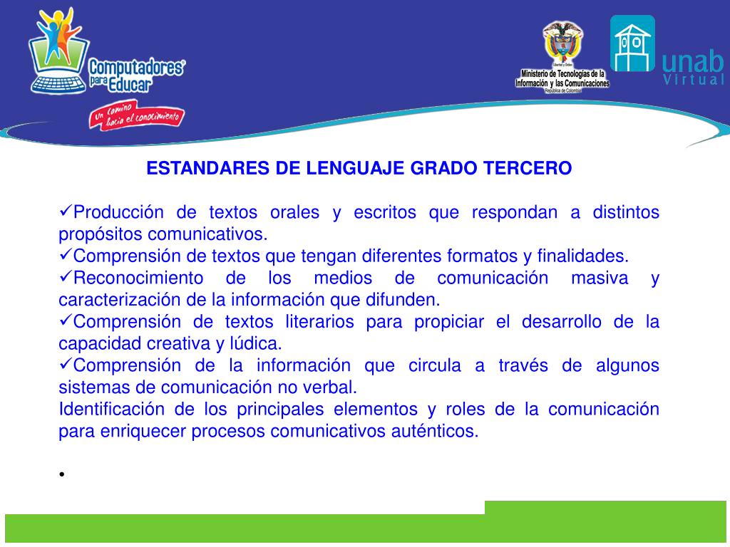 ESTANDARES DE LENGUAJE GRADO TERCERO • Producción de textos orales y escritos que respondan a distintos propósitos comunicativos. • Comprensión de textos que tengan diferentes formatos y finalidades. • Reconocimiento de los medios de comunicación masiva y caracterización de la información que difunden. • Comprensión de textos literarios para propiciar el desarrollo de la capacidad creativa y lúdica. • Comprensión de la información que circula a través de algunos sistemas de comunicación no verbal. • Identificación de los principales elementos y roles de la comunicación para enriquecer procesos comunicativos auténticos.