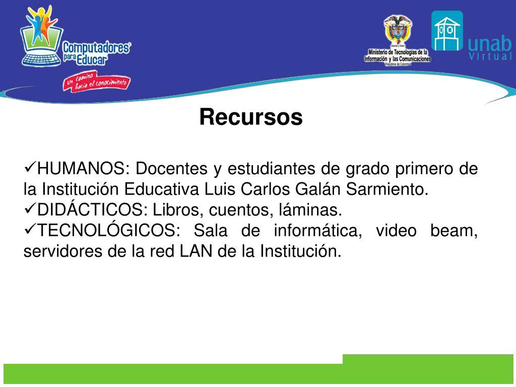 Recursos • HUMANOS: Docentes y estudiantes de grado primero de la Institución Educativa Luis Carlos Galán Sarmiento. • DIDÁCTICOS: Libros, cuentos, láminas. • TECNOLÓGICOS: Sala de informática, video beam, servidores de la red LAN de la Institución.