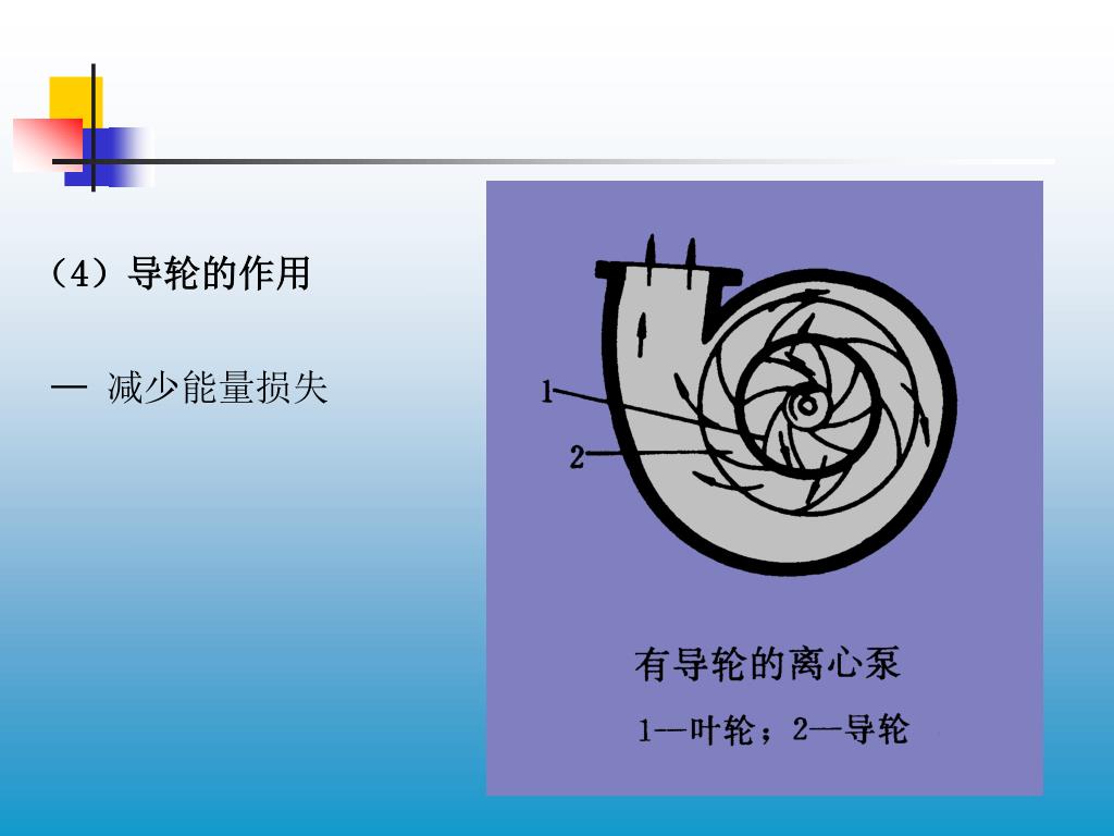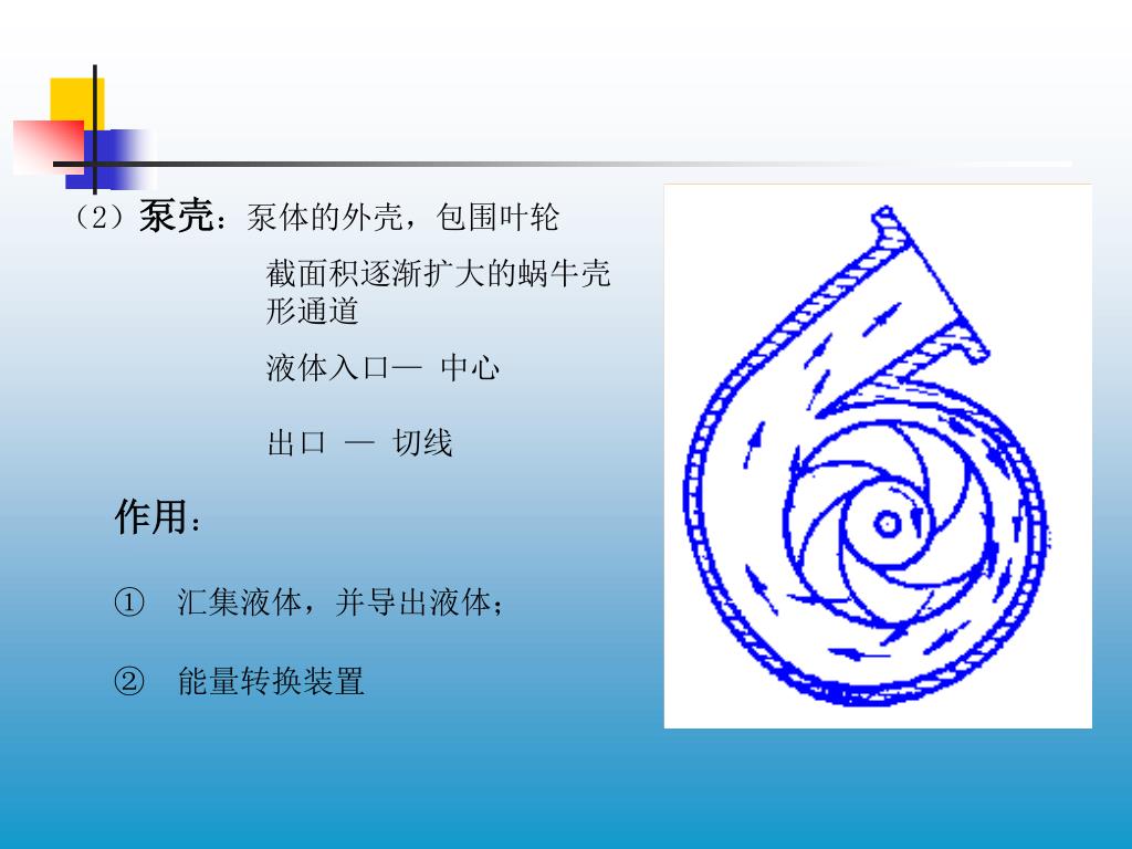 (2)泵壳:泵体的外壳,包围叶轮 截面积逐渐扩大的蜗牛壳形通道 液体入口— 中心 出口 — 切线 作用: ① 汇集液体,并导出液体; ② 能量转换装置