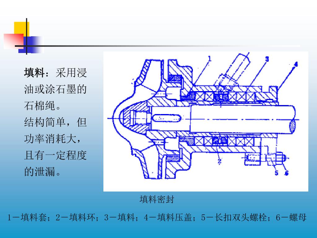填料:采用浸油或涂石墨的石棉绳。 结构简单,但功率消耗大,且有一定程度的泄漏。 填料密封 1-填料套;2-填料环;3-填料;4-填料压盖;5-长扣双头螺栓;6-螺母