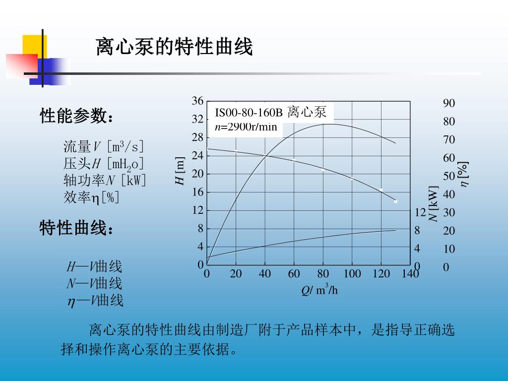 离心泵的特性曲线 性能参数: 流量V [m3/s] 压头H [mH2o] 轴功率N [kW] 效率[%] 特性曲线: H—V曲线 N—V曲线 —V曲线 离心泵的特性曲线由制造厂附于产品样本中,是指导正确选择和操作离心泵的主要依据。