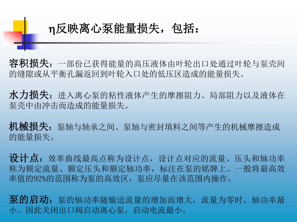 反映离心泵能量损失,包括: 容积损失:一部份已获得能量的高压液体由叶轮出口处通过叶轮与泵壳间的缝隙或从平衡孔漏返回到叶轮入口处的低压区造成的能量损失。 水力损失:进入离心泵的粘性液体产生的摩擦阻力、局部阻力以及液体在泵壳中由冲击而造成的能量损失。 机械损失:泵轴与轴承之间、泵轴与密封填料之间等产生的机械摩擦造成的能量损失。 设计点:效率曲线最高点称为设计点,设计点对应的流量、压头和轴功率称为额定流量、额定压头和额定轴功率,标注在泵的铭牌上。一般将最高效率值的92%的范围称为泵的高效区,泵应尽量在该范围内操作。 泵的启动:泵的轴功率随输送流量的增加而增大,流量为零时,轴功率最小。因此关闭出口阀启动离心泵,启动电流最小。