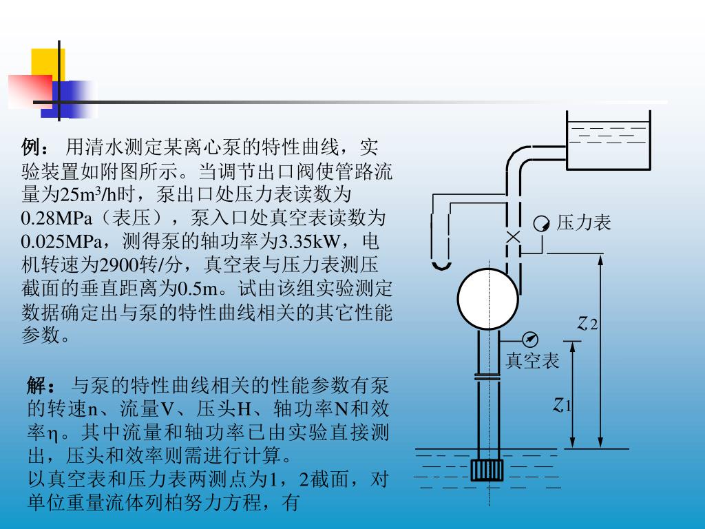例:用清水测定某离心泵的特性曲线,实验装置如附图所示。当调节出口阀使管路流量为25m3/h时,泵出口处压力表读数为0.28MPa(表压),泵入口处真空表读数为0.025MPa,测得泵的轴功率为3.35kW,电机转速为2900转/分,真空表与压力表测压截面的垂直距离为0.5m。试由该组实验测定数据确定出与泵的特性曲线相关的其它性能参数。 解:与泵的特性曲线相关的性能参数有泵的转速n、流量V、压头H、轴功率N和效率。其中流量和轴功率已由实验直接测出,压头和效率则需进行计算。 以真空表和压力表两测点为1,2截面,对单位重量流体列柏努力方程,有