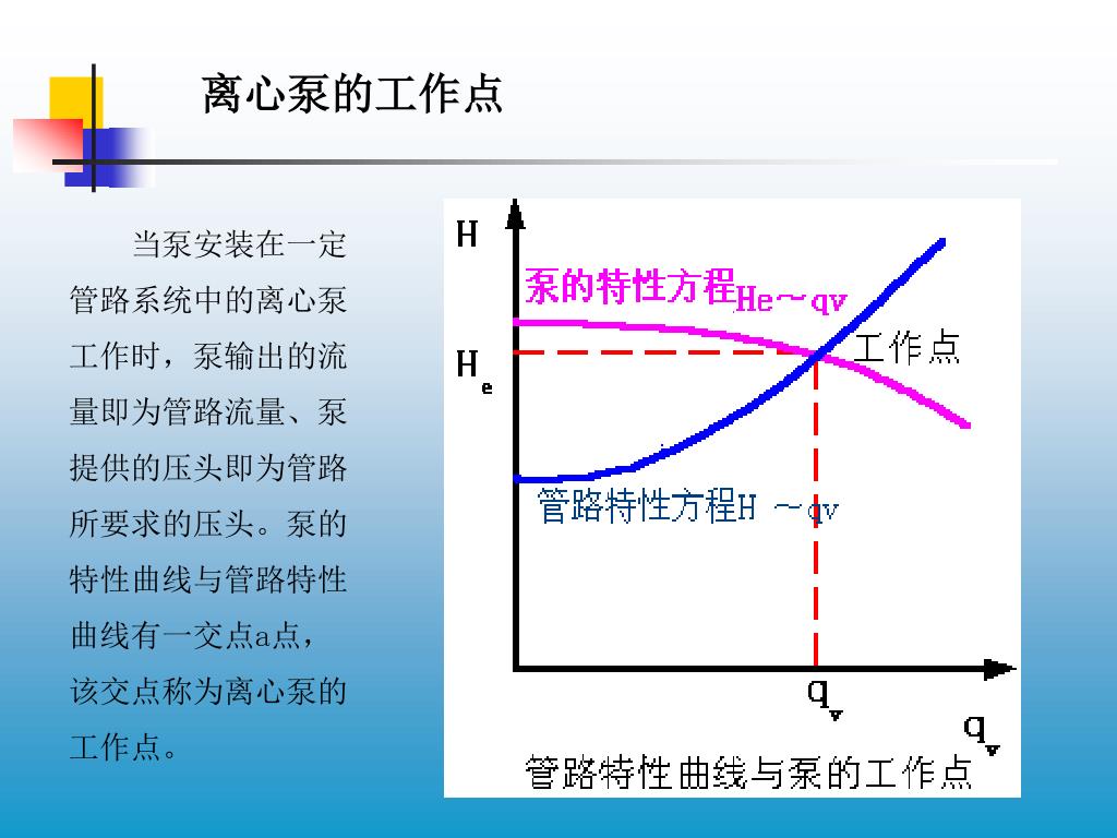 离心泵的工作点 当泵安装在一定管路系统中的离心泵工作时,泵输出的流量即为管路流量、泵提供的压头即为管路所要求的压头。泵的特性曲线与管路特性曲线有一交点a点,该交点称为离心泵的工作点。