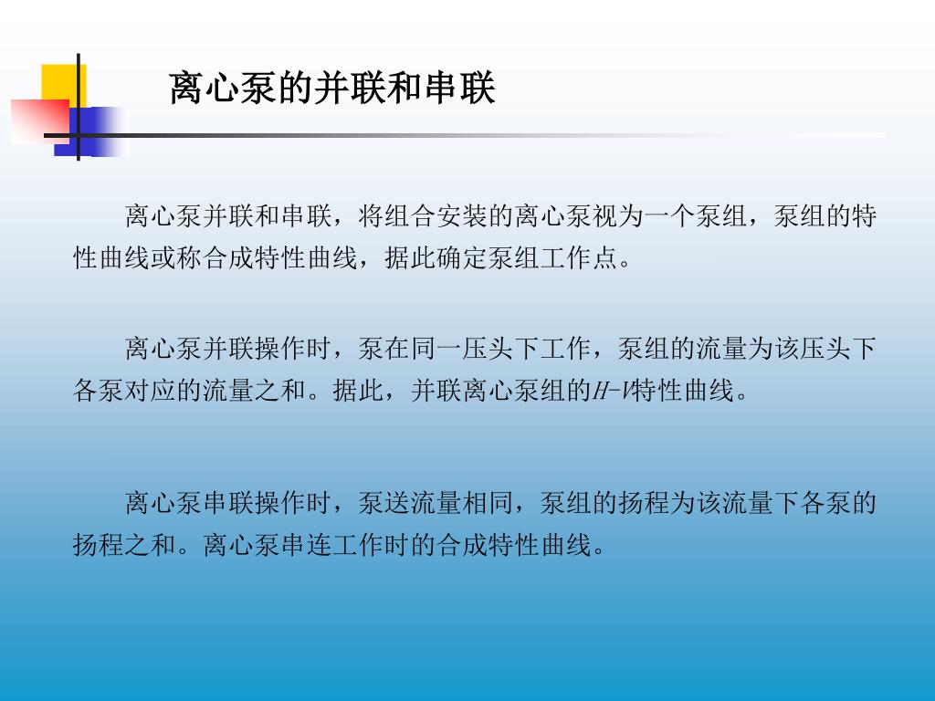 离心泵的并联和串联 离心泵并联和串联,将组合安装的离心泵视为一个泵组,泵组的特性曲线或称合成特性曲线,据此确定泵组工作点。 离心泵并联操作时,泵在同一压头下工作,泵组的流量为该压头下各泵对应的流量之和。据此,并联离心泵组的H-V特性曲线。 离心泵串联操作时,泵送流量相同,泵组的扬程为该流量下各泵的扬程之和。离心泵串连工作时的合成特性曲线。