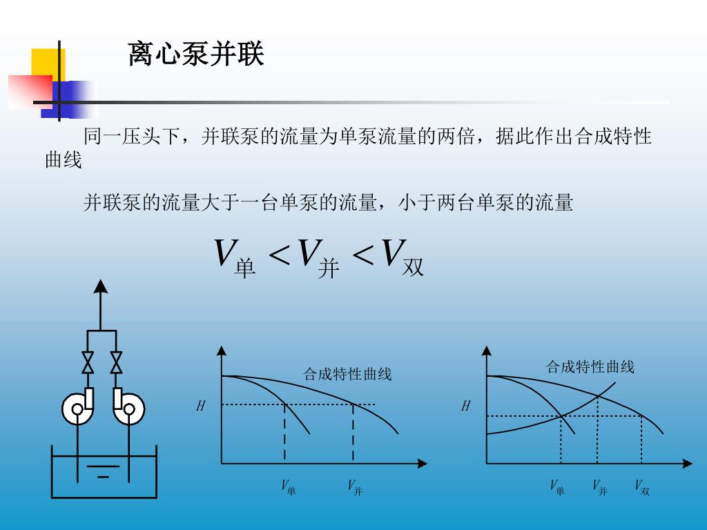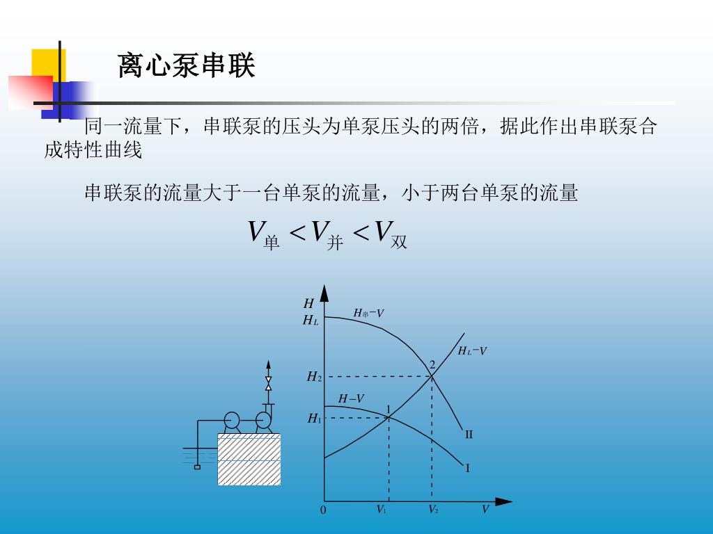 离心泵串联 同一流量下,串联泵的压头为单泵压头的两倍,据此作出串联泵合成特性曲线 串联泵的流量大于一台单泵的流量,小于两台单泵的流量