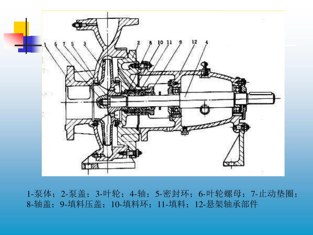 1-泵体;2-泵盖;3-叶轮;4-轴;5-密封环;6-叶轮螺母;7-止动垫圈;8-轴盖;9-填料压盖;10-填料环;11-填料;12-悬架轴承部件