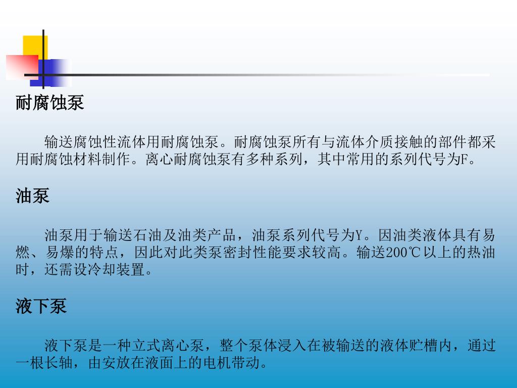 耐腐蚀泵 输送腐蚀性流体用耐腐蚀泵。耐腐蚀泵所有与流体介质接触的部件都采用耐腐蚀材料制作。离心耐腐蚀泵有多种系列,其中常用的系列代号为F。 油泵 油泵用于输送石油及油类产品,油泵系列代号为Y。因油类液体具有易燃、易爆的特点,因此对此类泵密封性能要求较高。输送200℃以上的热油时,还需设冷却装置。 液下泵 液下泵是一种立式离心泵,整个泵体浸入在被输送的液体贮槽内,通过一根长轴,由安放在液面上的电机带动。