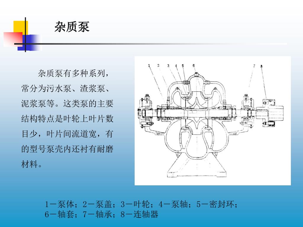 杂质泵 杂质泵有多种系列,常分为污水泵、渣浆泵、泥浆泵等。这类泵的主要结构特点是叶轮上叶片数目少,叶片间流道宽,有的型号泵壳内还衬有耐磨材料。 1-泵体;2-泵盖;3-叶轮;4-泵轴;5-密封环; 6-轴套;7-轴承;8-连轴器
