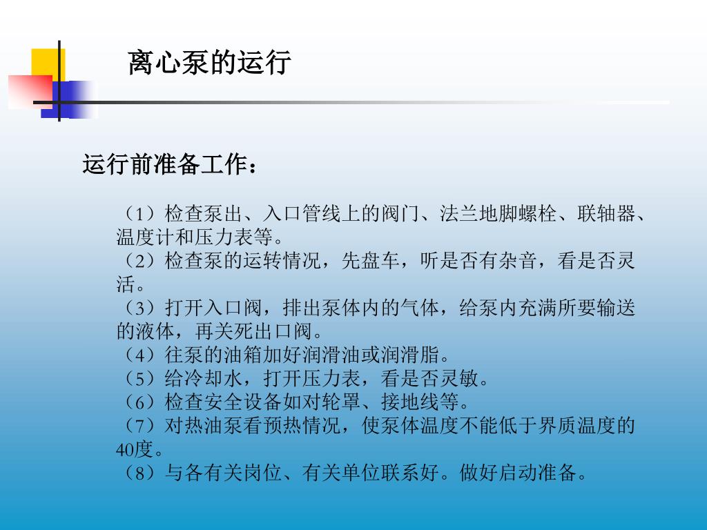 离心泵的运行 运行前准备工作: (1)检查泵出、入口管线上的阀门、法兰地脚螺栓、联轴器、 温度计和压力表等。 (2)检查泵的运转情况,先盘车,听是否有杂音,看是否灵 活。 (3)打开入口阀,排出泵体内的气体,给泵内充满所要输送 的液体,再关死出口阀。 (4)往泵的油箱加好润滑油或润滑脂。 (5)给冷却水,打开压力表,看是否灵敏。 (6)检查安全设备如对轮罩、接地线等。 (7)对热油泵看预热情况,使泵体温度不能低于界质温度的 40度。 (8)与各有关岗位、有关单位联系好。做好启动准备。