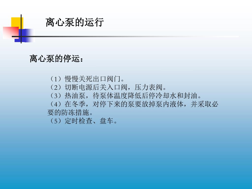 离心泵的运行 离心泵的停运: (1)慢慢关死出口阀门。 (2)切断电源后关入口阀,压力表阀。 (3)热油泵,待泵体温度降低后停冷却水和封油。 (4)在冬季,对停下来的泵要放掉泵内液体,并采取必 要的防冻措施。 (5)定时检查、盘车。