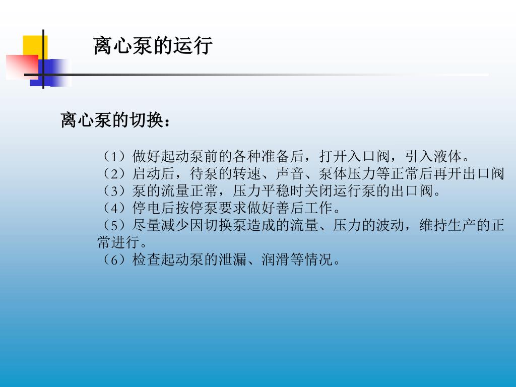 离心泵的运行 离心泵的切换: (1)做好起动泵前的各种准备后,打开入口阀,引入液体。 (2)启动后,待泵的转速、声音、泵体压力等正常后再开出口阀 (3)泵的流量正常,压力平稳时关闭运行泵的出口阀。 (4)停电后按停泵要求做好善后工作。 (5)尽量减少因切换泵造成的流量、压力的波动,维持生产的正 常进行。 (6)检查起动泵的泄漏、润滑等情况。