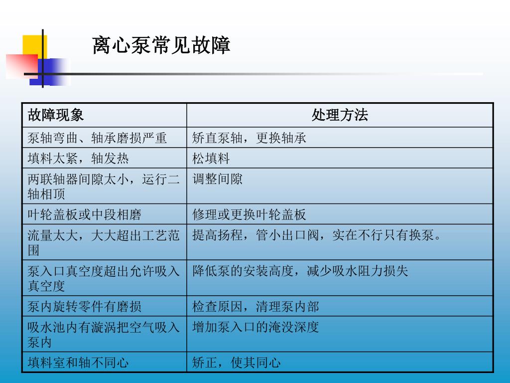 离心泵的运行 正常启动: (1)准备工作经检查正常后可启动泵。启动后应注意电流表, 泵转向,压力表,泄漏等情况,一切正常后再慢慢打开出口阀。 (未打开出口阀前泵运转不得超过3分钟,否则液体在泵内强制 循环后温度升高,液体汽化会产生抽空等现象。) (2)检查泵的轴承温度不得大于65度,电机温度不得大于70度 (3)可用泵出口阀门调节流量 (4)观察出口压力表、电流表的波动情况 (5)检查泵的运行、振动、泄漏情况。 (6)检查泵冷却水的供应情况,润滑油液面的变化情况。 (7)打封油的泵,封油压力至少高出泵出口压力0.05-0.1MPa. (8)对于长周期运转的泵,要定期更换润滑油或润滑脂,保证 泵在良好的润滑状态下工作。