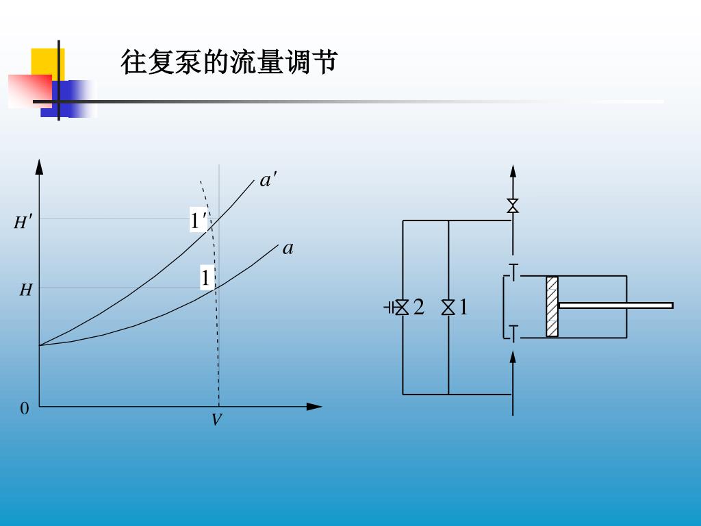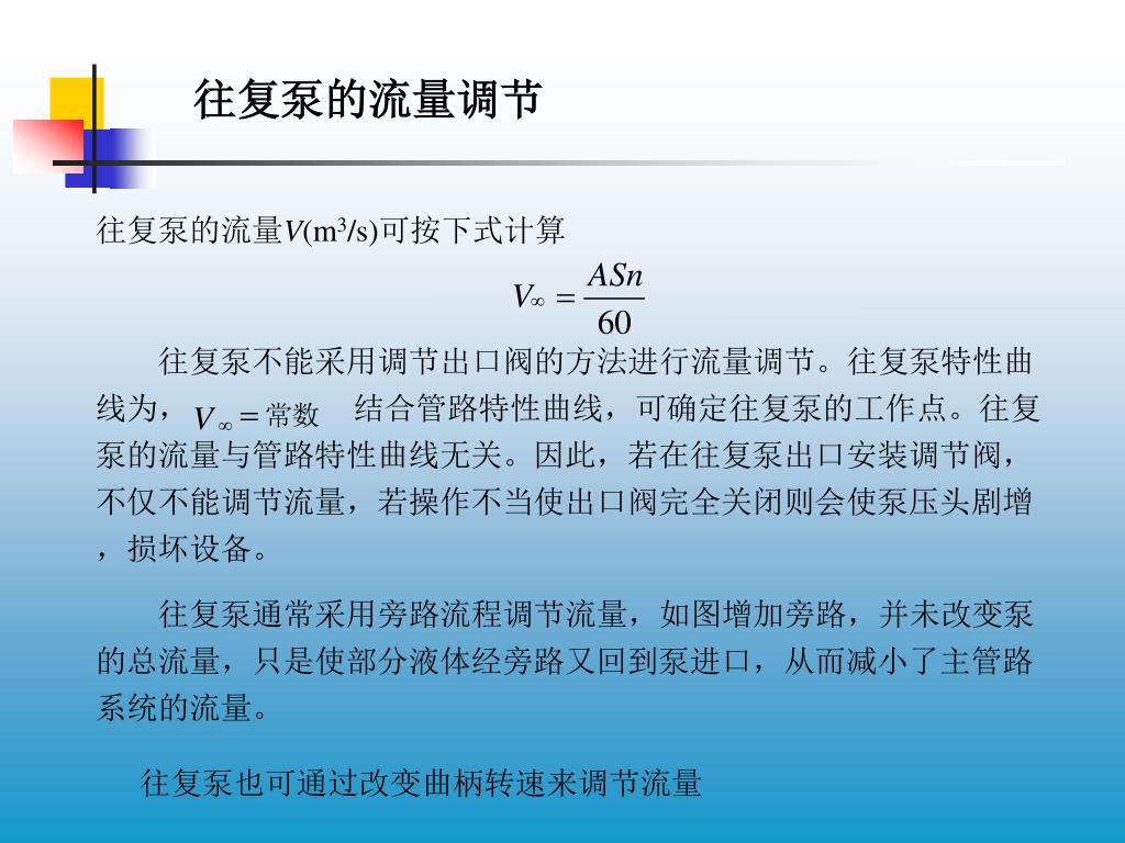 往复泵的流量调节 往复泵的流量V(m3/s)可按下式计算 往复泵不能采用调节出口阀的方法进行流量调节。往复泵特性曲线为, 结合管路特性曲线,可确定往复泵的工作点。往复泵的流量与管路特性曲线无关。因此,若在往复泵出口安装调节阀,不仅不能调节流量,若操作不当使出口阀完全关闭则会使泵压头剧增,损坏设备。 往复泵通常采用旁路流程调节流量,如图增加旁路,并未改变泵的总流量,只是使部分液体经旁路又回到泵进口,从而减小了主管路系统的流量。 往复泵也可通过改变曲柄转速来调节流量