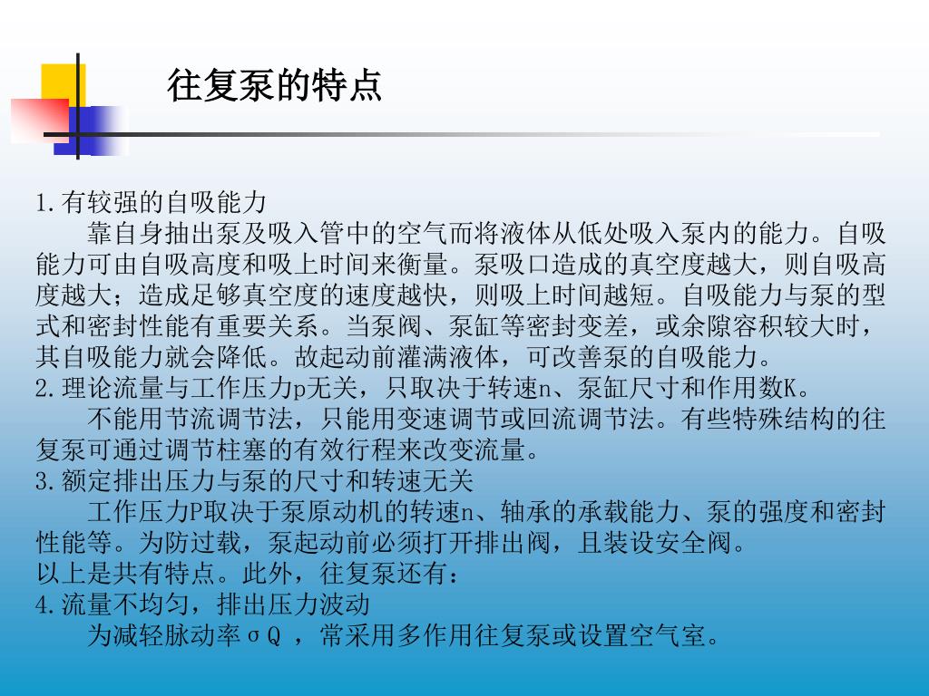 往复泵的特点 1.有较强的自吸能力 靠自身抽出泵及吸入管中的空气而将液体从低处吸入泵内的能力。自吸能力可由自吸高度和吸上时间来衡量。泵吸口造成的真空度越大,则自吸高度越大;造成足够真空度的速度越快,则吸上时间越短。自吸能力与泵的型式和密封性能有重要关系。当泵阀、泵缸等密封变差,或余隙容积较大时,其自吸能力就会降低。故起动前灌满液体,可改善泵的自吸能力。 2.理论流量与工作压力p无关,只取决于转速n、泵缸尺寸和作用数K。 不能用节流调节法,只能用变速调节或回流调节法。有些特殊结构的往复泵可通过调节柱塞的有效行程来改变流量。 3.额定排出压力与泵的尺寸和转速无关 工作压力P取决于泵原动机的转速n、轴承的承载能力、泵的强度和密封性能等。为防过载,泵起动前必须打开排出阀,且装设安全阀。 以上是共有特点。此外,往复泵还有: 4.流量不均匀,排出压力波动 为减轻脉动率σQ ,常采用多作用往复泵或设置空气室。