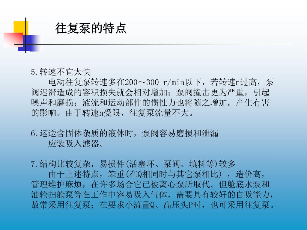 往复泵的特点 5.转速不宜太快 电动往复泵转速多在200~300 r/min以下,若转速n过高,泵阀迟滞造成的容积损失就会相对增加;泵阀撞击更为严重,引起噪声和磨损;液流和运动部件的惯性力也将随之增加,产生有害的影响。由于转速n受限,往复泵流量不大。 6.运送含固体杂质的液体时,泵阀容易磨损和泄漏 应装吸入滤器。 7.结构比较复杂,易损件(活塞环、泵阀、填料等)较多 由于上述特点,笨重(在Q相同时与其它泵相比) ,造价高,管理维护麻烦,在许多场合它已被离心泵所取代。但舱底水泵和油轮扫舱泵等在工作中容易吸入气体,需要具有较好的自吸能力,故常采用往复泵;在要求小流量Q、高压头P时,也可采用往复泵。