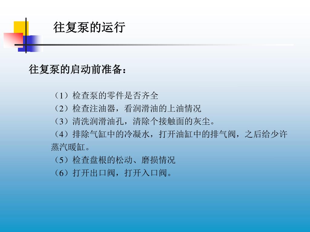 往复泵的运行 往复泵的启动前准备: (1)检查泵的零件是否齐全 (2)检查注油器,看润滑油的上油情况 (3)清洗润滑油孔,清除个接触面的灰尘。 (4)排除气缸中的冷凝水,打开油缸中的排气阀,之后给少许 蒸汽暖缸。 (5)检查盘根的松动、磨损情况 (6)打开出口阀,打开入口阀。