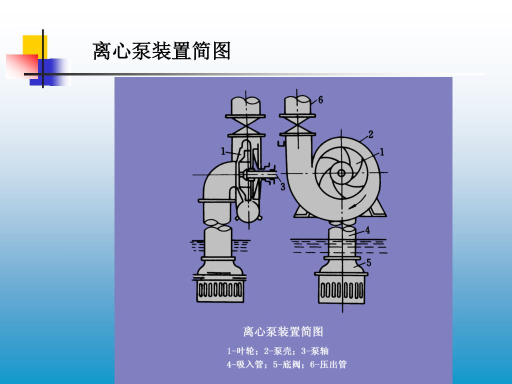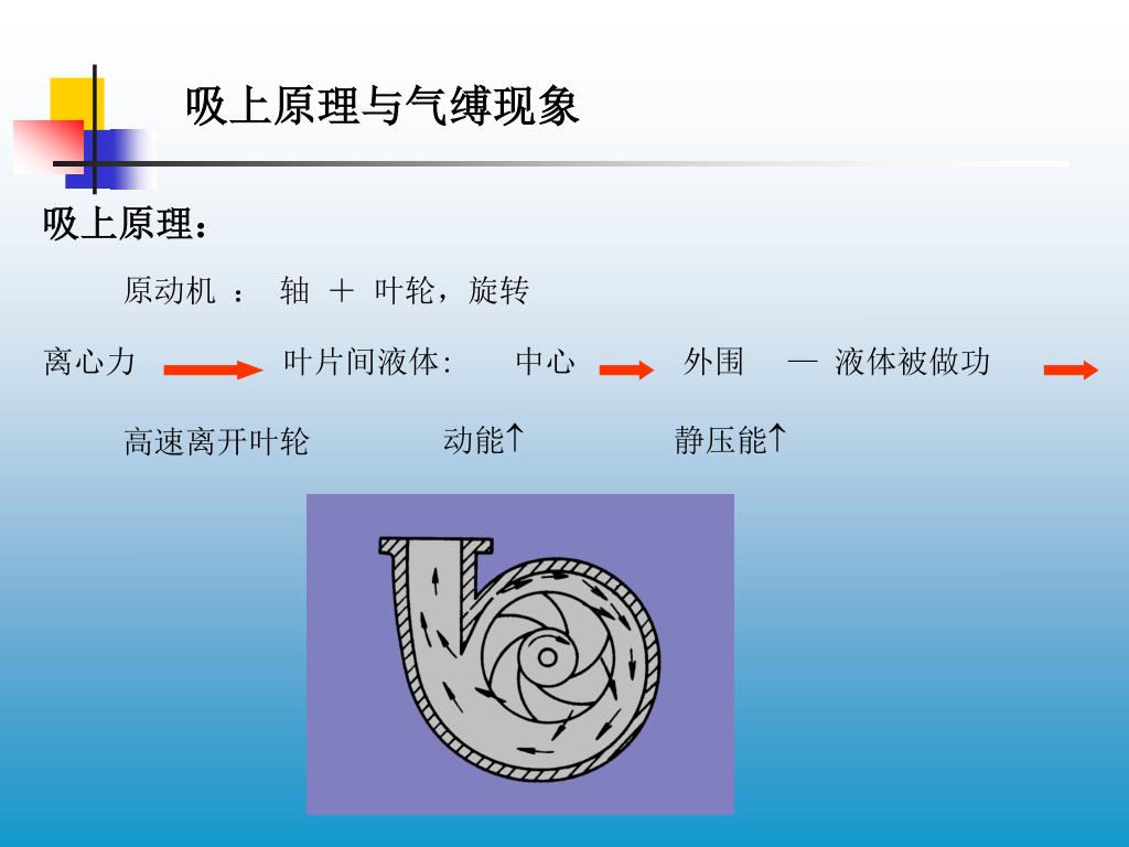 吸上原理与气缚现象 吸上原理: 原动机 : 轴 + 叶轮,旋转 离心力 叶片间液体: 中心 外围 — 液体被做功 高速离开叶轮 动能 静压能