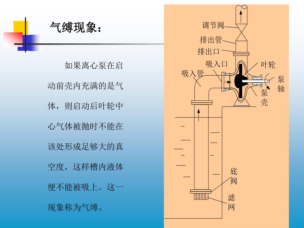 气缚现象: 如果离心泵在启动前壳内充满的是气体,则启动后叶轮中心气体被抛时不能在该处形成足够大的真空度,这样槽内液体便不能被吸上。这一现象称为气缚。