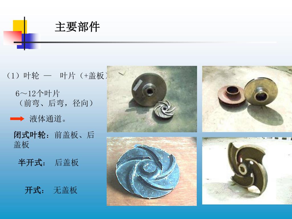 主要部件 (1)叶轮 — 叶片(+盖板) 6~12个叶片 (前弯、后弯,径向) 液体通道。 闭式叶轮:前盖板、后盖板 半开式: 后盖板 开式: 无盖板