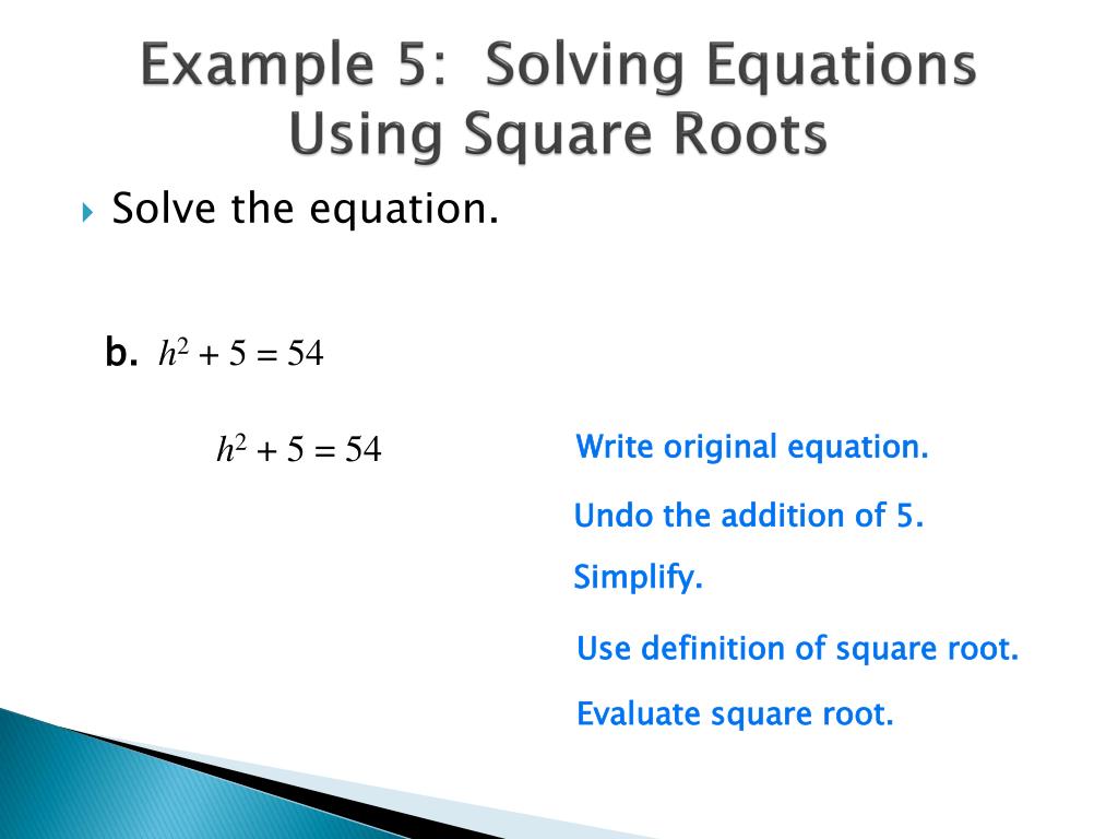 Example 5: Solving Equations Using Square Roots • Solve the equation. b.h2+ 5 = 54 h2+ 5 = 54 Write original equation. Undo the addition of 5. Simplify. Use definition of square root. Evaluate square root.