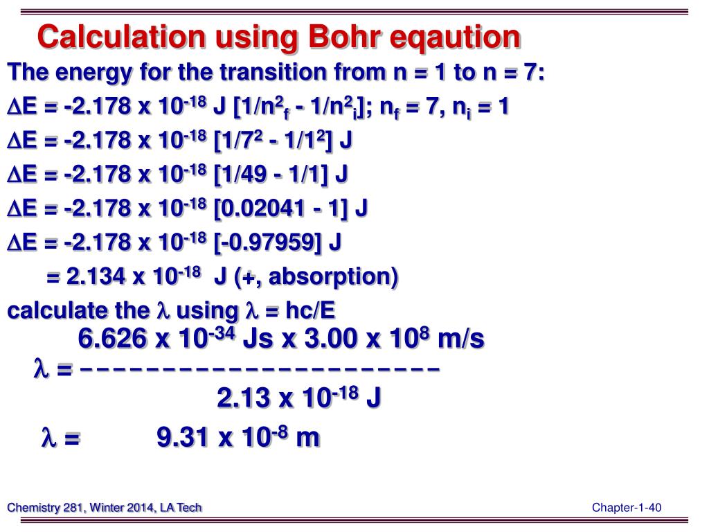 Calculation using Bohr eqaution The energy for the transition from n = 1 to n = 7: DE = -2.178 x 10-18 J [1/n2f - 1/n2i]; nf = 7, ni = 1 DE = -2.178 x 10-18 [1/72 - 1/12] J DE = -2.178 x 10-18 [1/49 - 1/1] J DE = -2.178 x 10-18 [0.02041 - 1] J DE = -2.178 x 10-18 [-0.97959] J = 2.134 x 10-18 J (+, absorption) calculate the l using l = hc/E 6.626 x 10-34 Js x 3.00 x 108 m/s l = ---------------------- 2.13 x 10-18 J l = 9.31 x 10-8 m