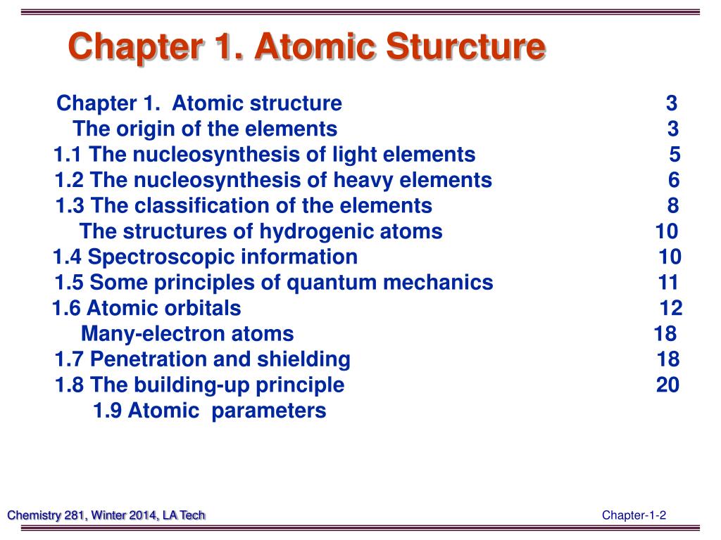 Chapter 1. Atomic Sturcture Chapter 1. Atomic structure 3 The origin of the elements 3 1.1 The nucleosynthesis of light elements 5 1.2 The nucleosynthesis of heavy elements 6 1.3 The classification of the elements 8 The structures of hydrogenic atoms 10 1.4 Spectroscopic information 10 1.5 Some principles of quantum mechanics 11 1.6 Atomic orbitals 12 Many-electron atoms 18 1.7 Penetration and shielding 18 1.8 The building-up principle 20 1.9 Atomic parameters