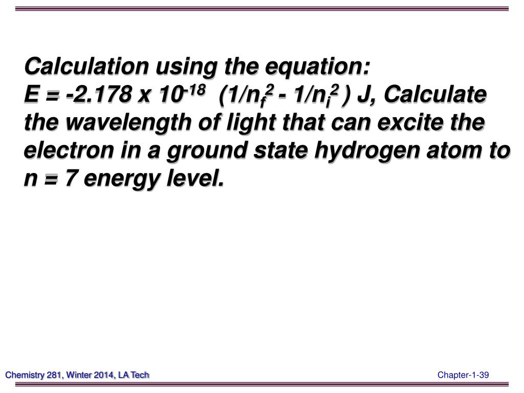 Calculation using the equation: E = -2.178 x 10-18 (1/nf2 - 1/ni2 ) J, Calculate the wavelength of light that can excite the electron in a ground state hydrogen atom to n = 7 energy level.