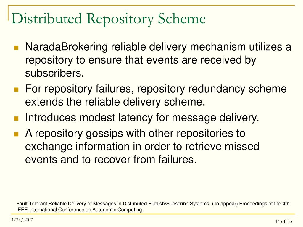 Distributed Repository Scheme • NaradaBrokering reliable delivery mechanism utilizes a repository to ensure that events are received by subscribers. • For repository failures, repository redundancy scheme extends the reliable delivery scheme. • Introduces modest latency for message delivery. • A repository gossips with other repositories to exchange information in order to retrieve missed events and to recover from failures. Fault-Tolerant Reliable Delivery of Messages in Distributed Publish/Subscribe Systems. (To appear) Proceedings of the 4th IEEE International Conference on Autonomic Computing.